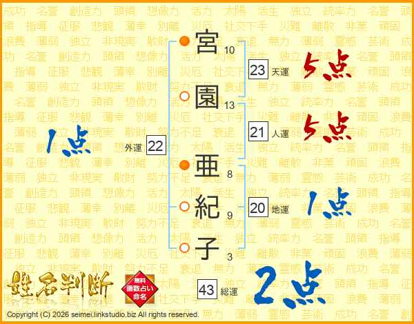 宮園亜紀子さんの総運は43画の2点!