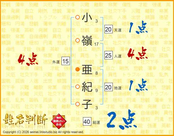 小(3画)嶺(17画) 亜(8画)紀(9画)子(3画)