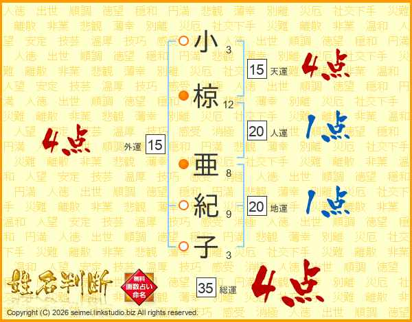 小(3画)椋(12画) 亜(8画)紀(9画)子(3画)
