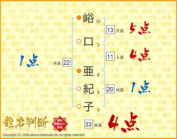峪(10画)口(3画) 亜(8画)紀(9画)子(3画)