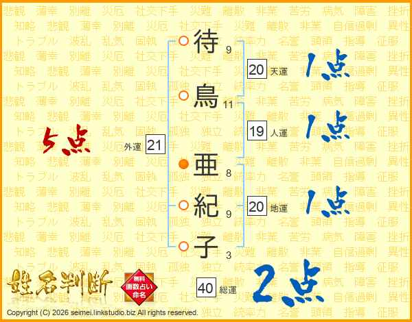 待(9画)鳥(11画) 亜(8画)紀(9画)子(3画)