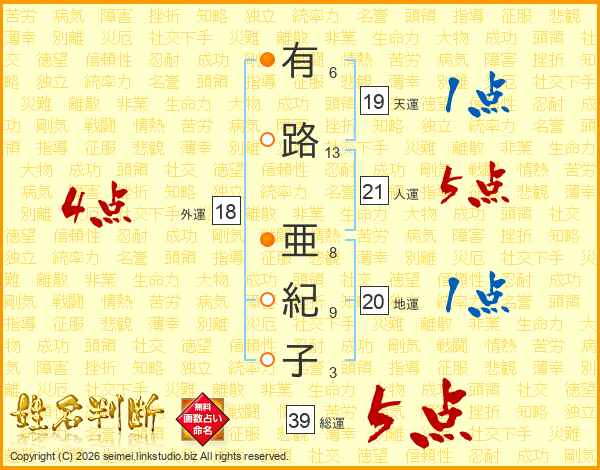 有(6画)路(13画) 亜(8画)紀(9画)子(3画)