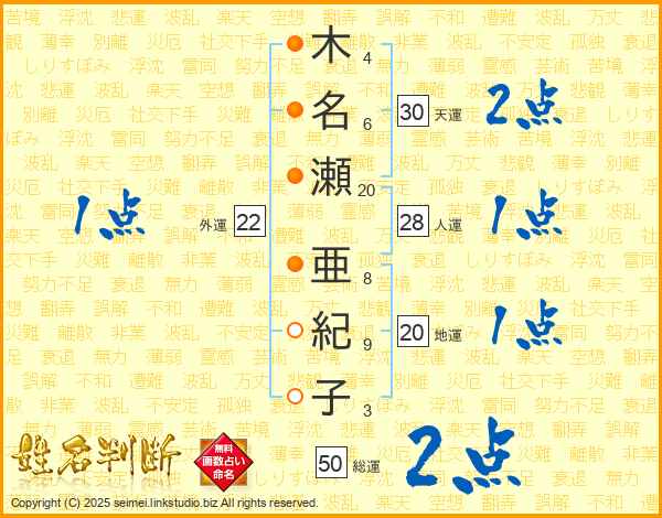 木(4画)名(6画)瀬(20画) 亜(8画)紀(9画)子(3画)