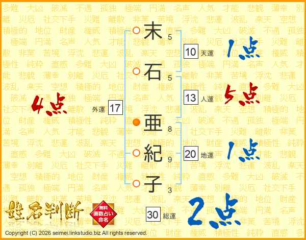 末(5画)石(5画) 亜(8画)紀(9画)子(3画)