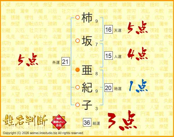 柿坂亜紀子さんの総運は36画の3点!