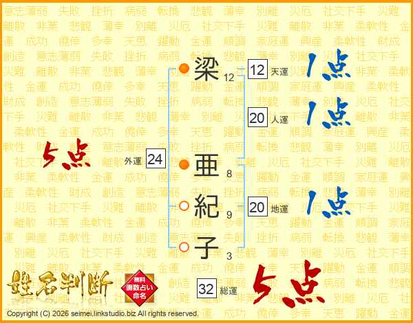 梁亜紀子さんの総運は32画の5点!