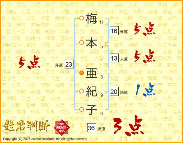 梅(11画)本(5画) 亜(8画)紀(9画)子(3画)