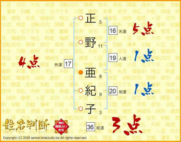 正(5画)野(11画) 亜(8画)紀(9画)子(3画)