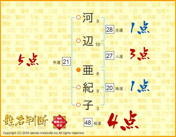 河(9画)辺(19画) 亜(8画)紀(9画)子(3画)