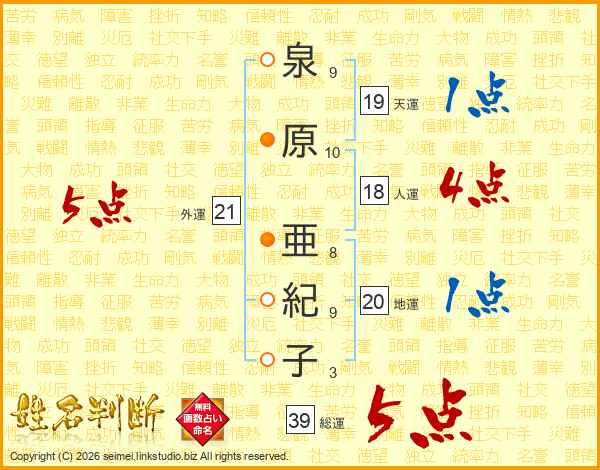 泉原亜紀子さんの総運は39画の5点!