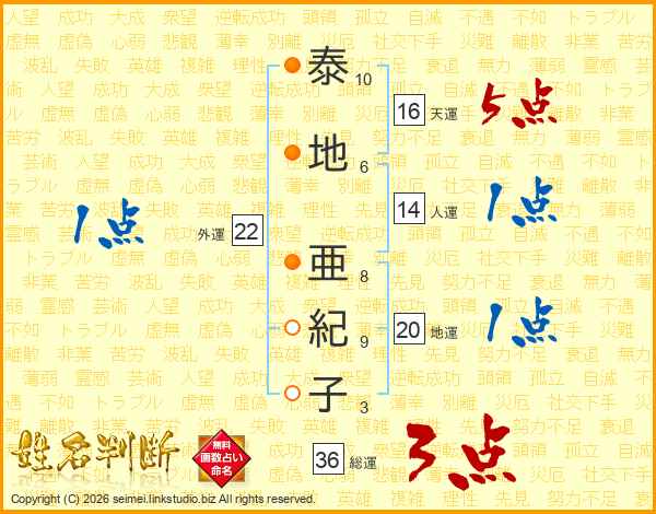 泰(10画)地(6画) 亜(8画)紀(9画)子(3画)