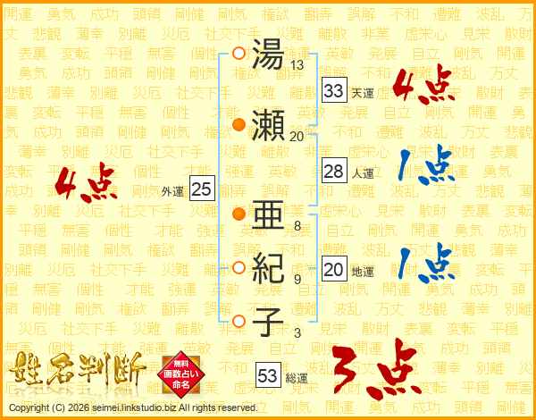湯瀬亜紀子さんの天運は33画の4点!
