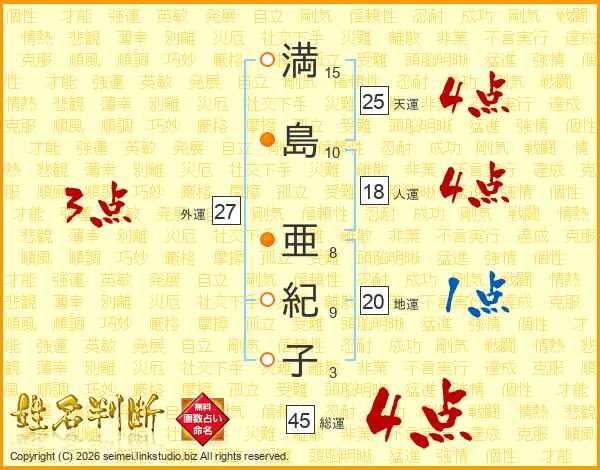 満(15画)島(10画) 亜(8画)紀(9画)子(3画)
