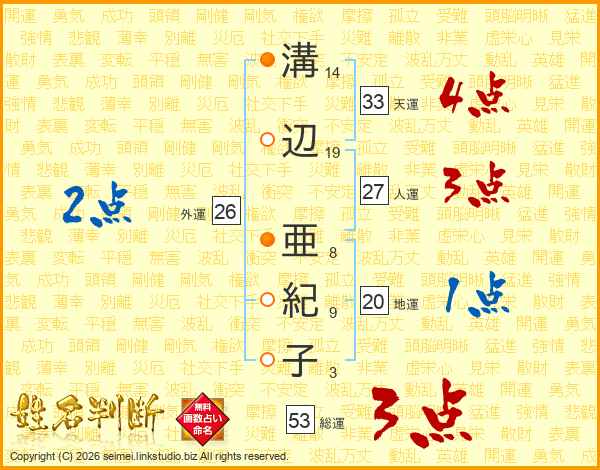 溝(14画)辺(19画) 亜(8画)紀(9画)子(3画)