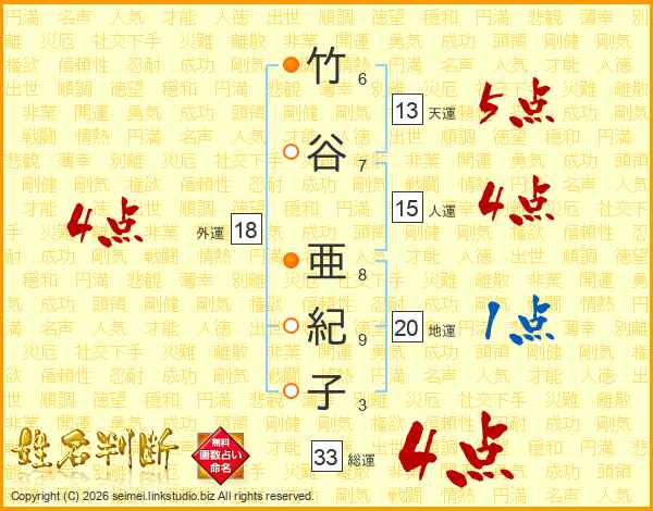 竹谷亜紀子さんの総運は33画の4点!