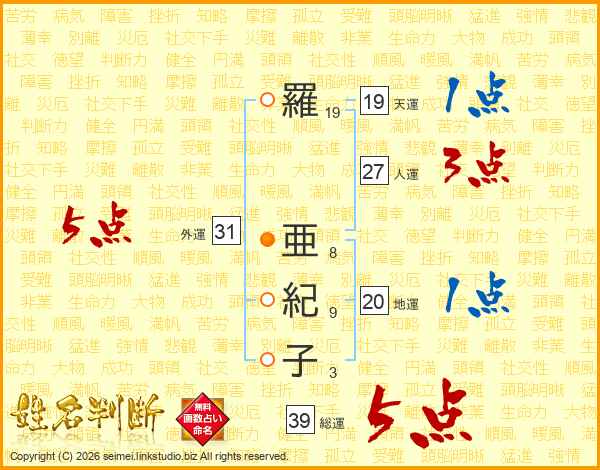 羅(19画) 亜(8画)紀(9画)子(3画)