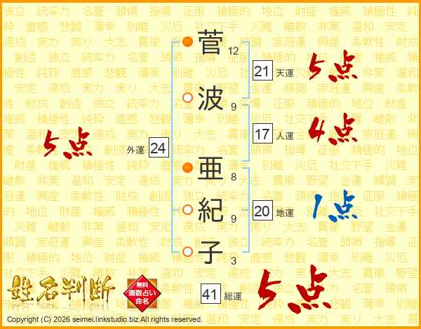 菅波亜紀子さんの総運は41画の5点!
