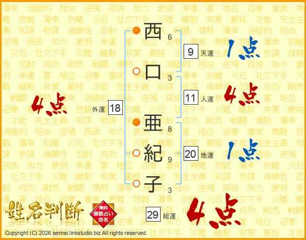 西(6画)口(3画) 亜(8画)紀(9画)子(3画)