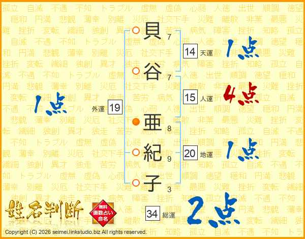 貝(7画)谷(7画) 亜(8画)紀(9画)子(3画)
