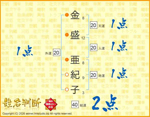 金(8画)盛(12画) 亜(8画)紀(9画)子(3画)