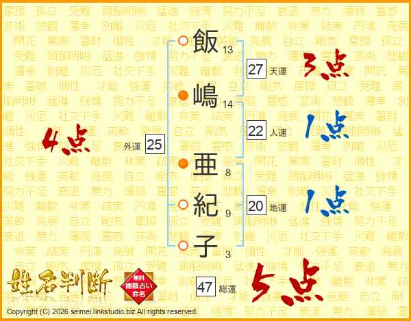 飯(13画)嶋(14画) 亜(8画)紀(9画)子(3画)