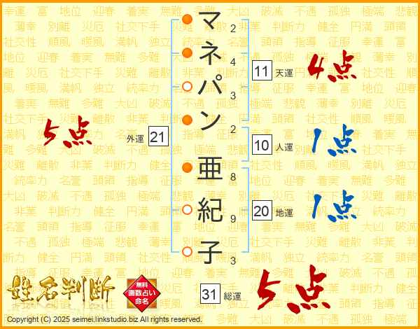 マ(2画)ネ(4画)パ(3画)ン(2画) 亜(8画)紀(9画)子(3画)