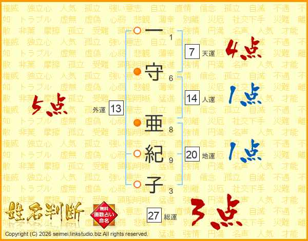 一(1画)守(6画) 亜(8画)紀(9画)子(3画)