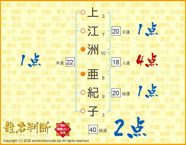 上(3画)江(7画)洲(10画) 亜(8画)紀(9画)子(3画)