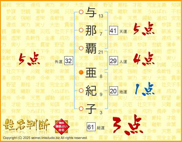 与那覇亜紀子さんの天運は41画の5点!