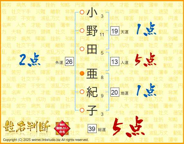 小野田亜紀子さんの総運は39画の5点!