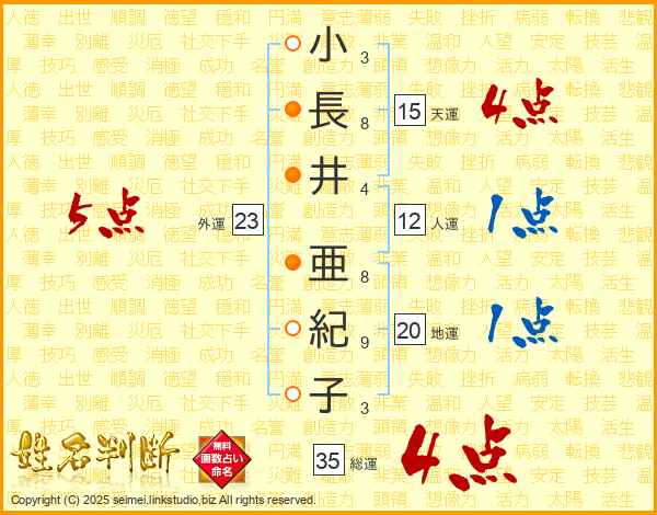小(3画)長(8画)井(4画) 亜(8画)紀(9画)子(3画)