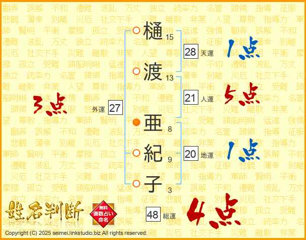 樋(15画)渡(13画) 亜(8画)紀(9画)子(3画)