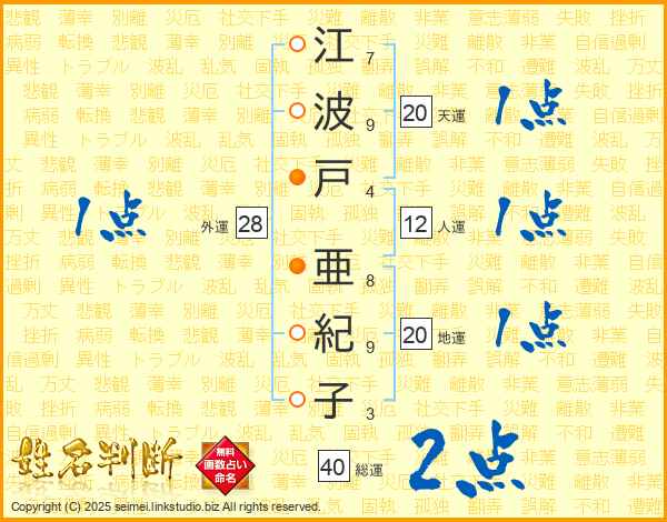 江(7画)波(9画)戸(4画) 亜(8画)紀(9画)子(3画)