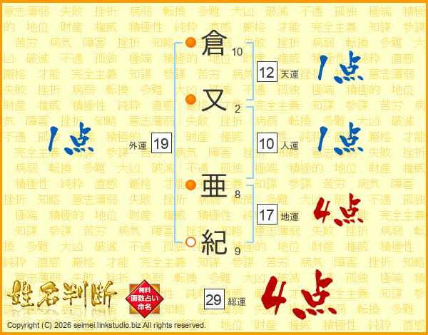 倉(10画)又(2画) 亜(8画)紀(9画)