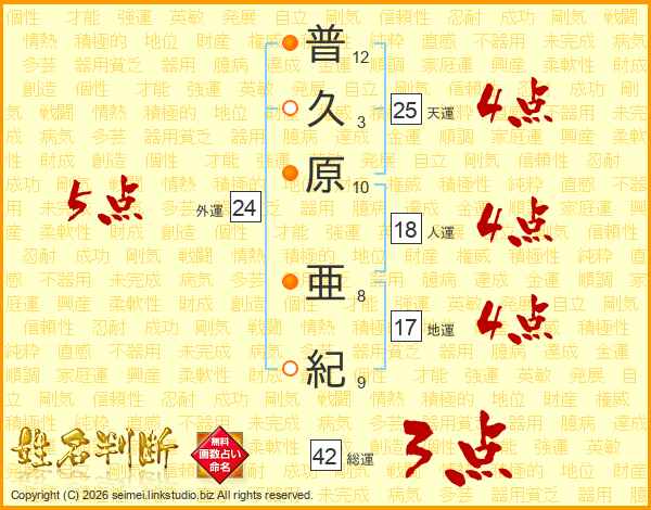 普(12画)久(3画)原(10画) 亜(8画)紀(9画)