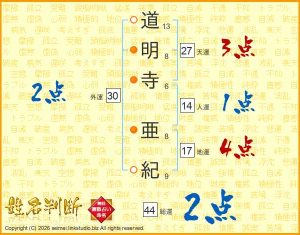 道明寺亜紀さんの総運は44画の2点!