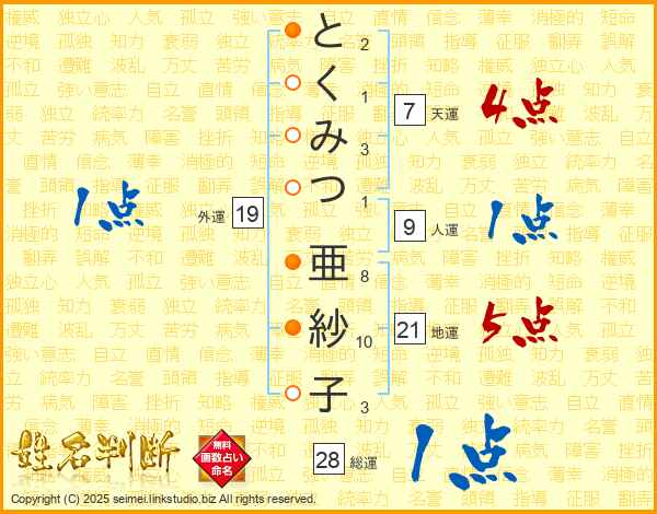 と(2画)く(1画)み(3画)つ(1画) 亜(8画)紗(10画)子(3画)
