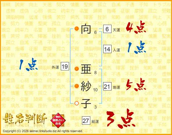 向(6画) 亜(8画)紗(10画)子(3画)