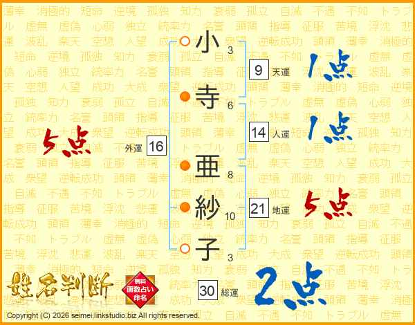 小(3画)寺(6画) 亜(8画)紗(10画)子(3画)
