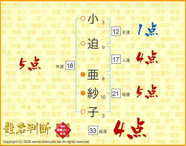 小迫亜紗子さんの総運は33画の4点!