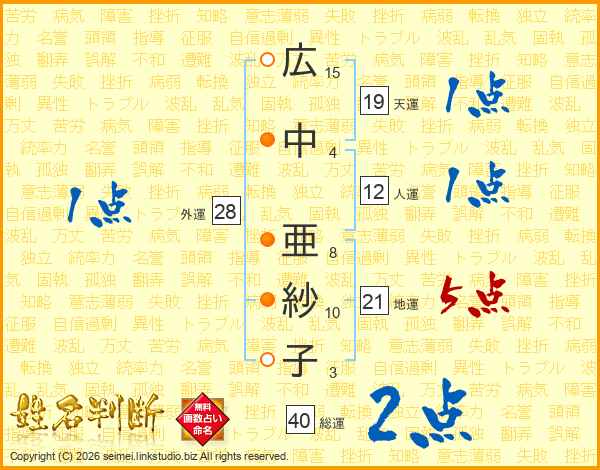 広(15画)中(4画) 亜(8画)紗(10画)子(3画)