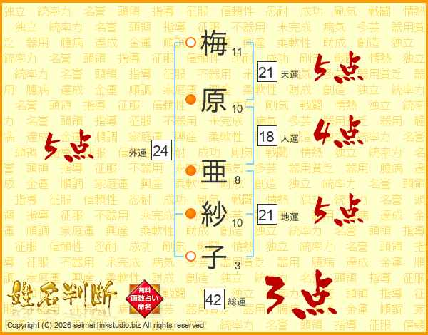 梅(11画)原(10画) 亜(8画)紗(10画)子(3画)