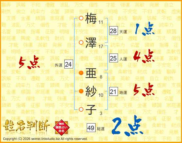 梅(11画)澤(17画) 亜(8画)紗(10画)子(3画)