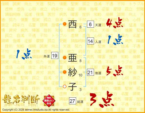 生活面を象徴する運勢です。外部から受ける影響力を表し、結婚運、家庭運や職場、環境への順応性を表します。総運から人運を引いた画数。姓や名が1文字の場合を除く。