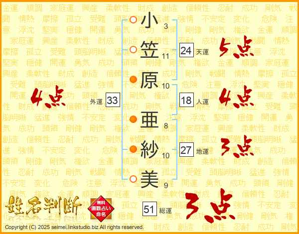 小(3画)笠(11画)原(10画) 亜(8画)紗(10画)美(9画)