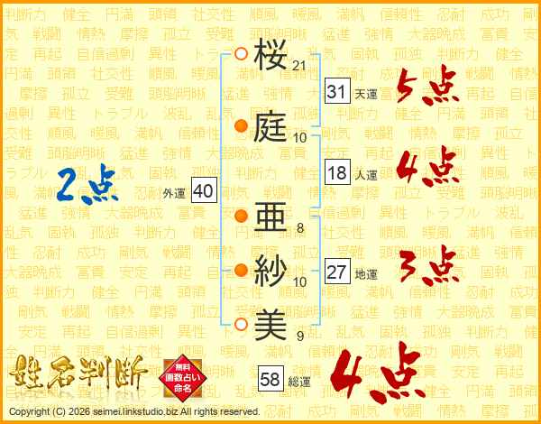 桜(21画)庭(10画) 亜(8画)紗(10画)美(9画)