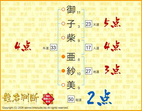 御(11画)子(3画)柴(9画) 亜(8画)紗(10画)美(9画)