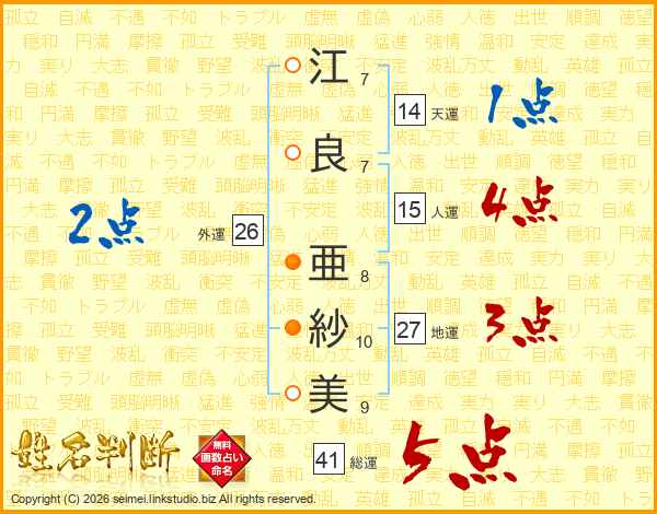 江(7画)良(7画) 亜(8画)紗(10画)美(9画)