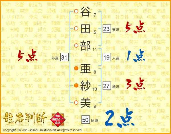 谷(7画)田(5画)部(11画) 亜(8画)紗(10画)美(9画)