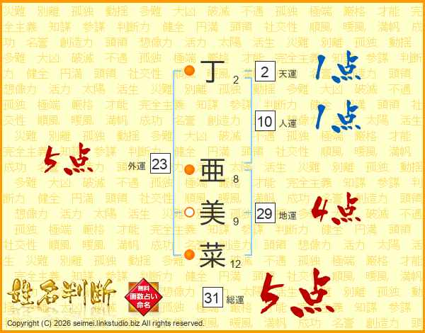 丁亜美菜さんの総運は31画の5点!